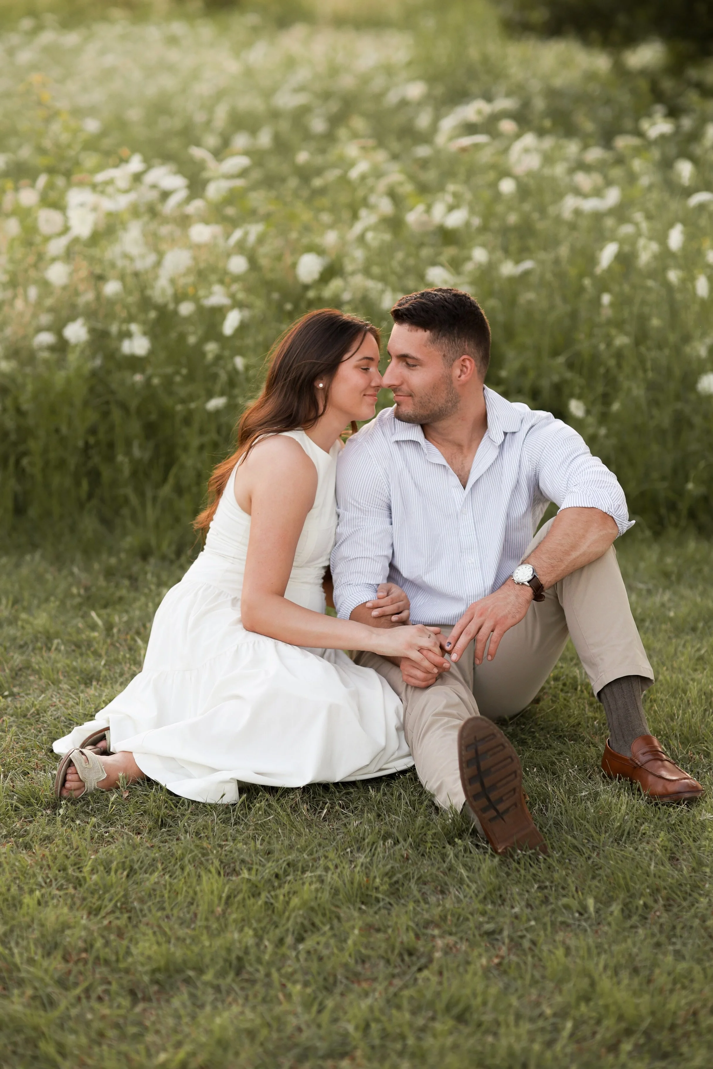 A young couple sitting on the grass during sunset in a field of white flowers, with the woman leaning on the man's shoulder and both gazing into the distance.