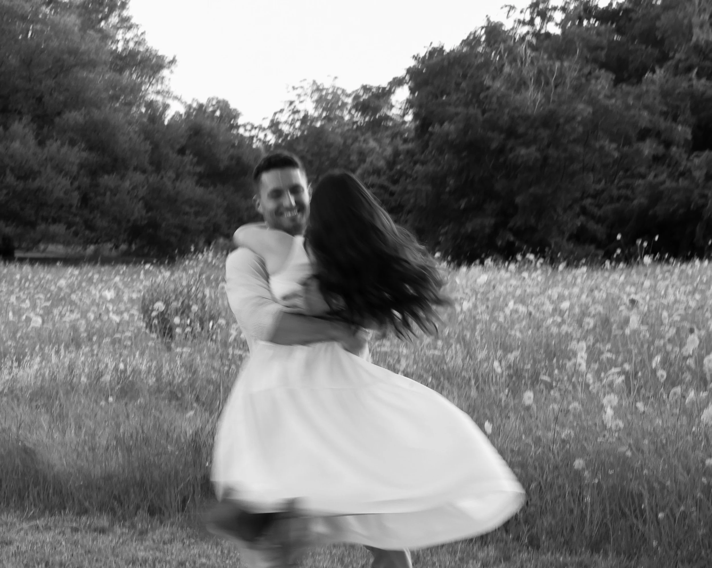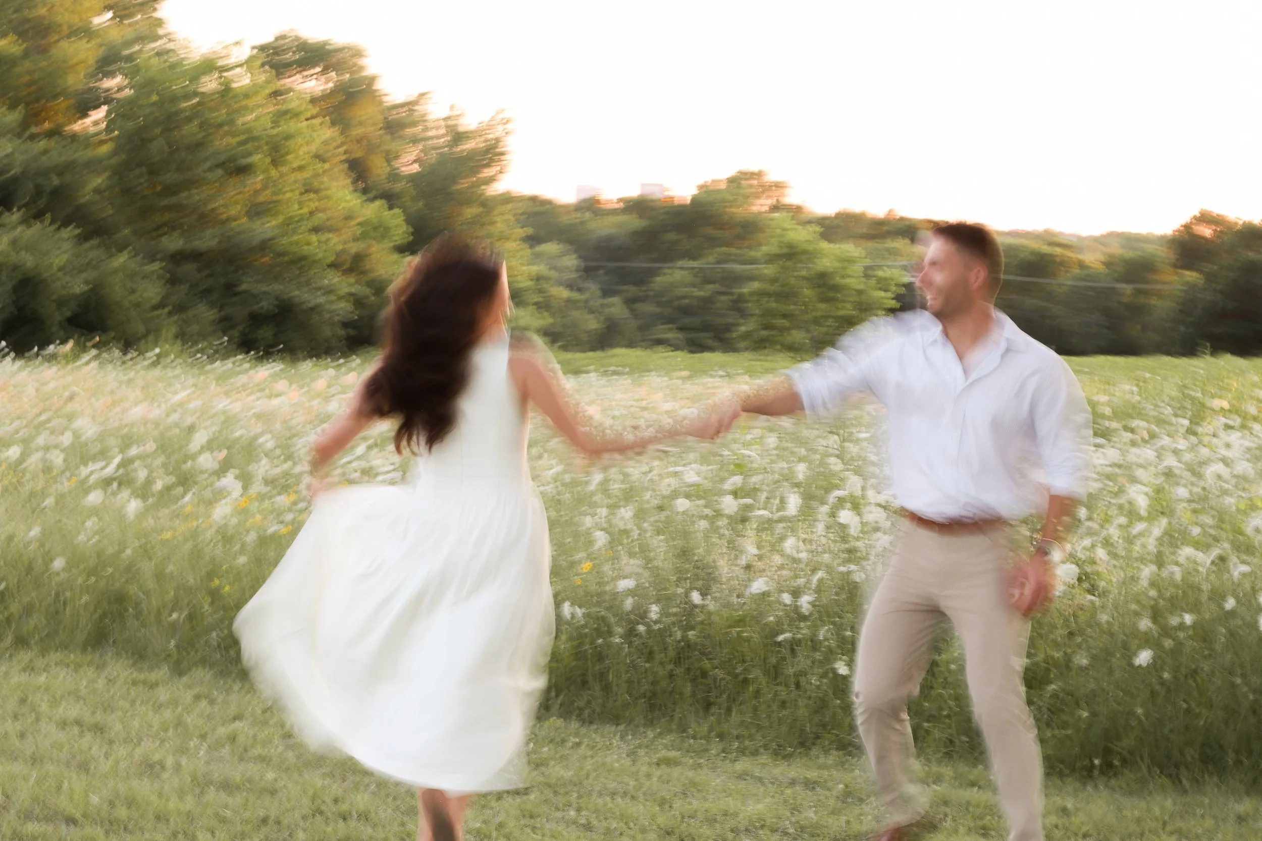 A woman in a white dress spinning in a field with a man in a light-colored shirt and pants, holding hands, with trees in the background.