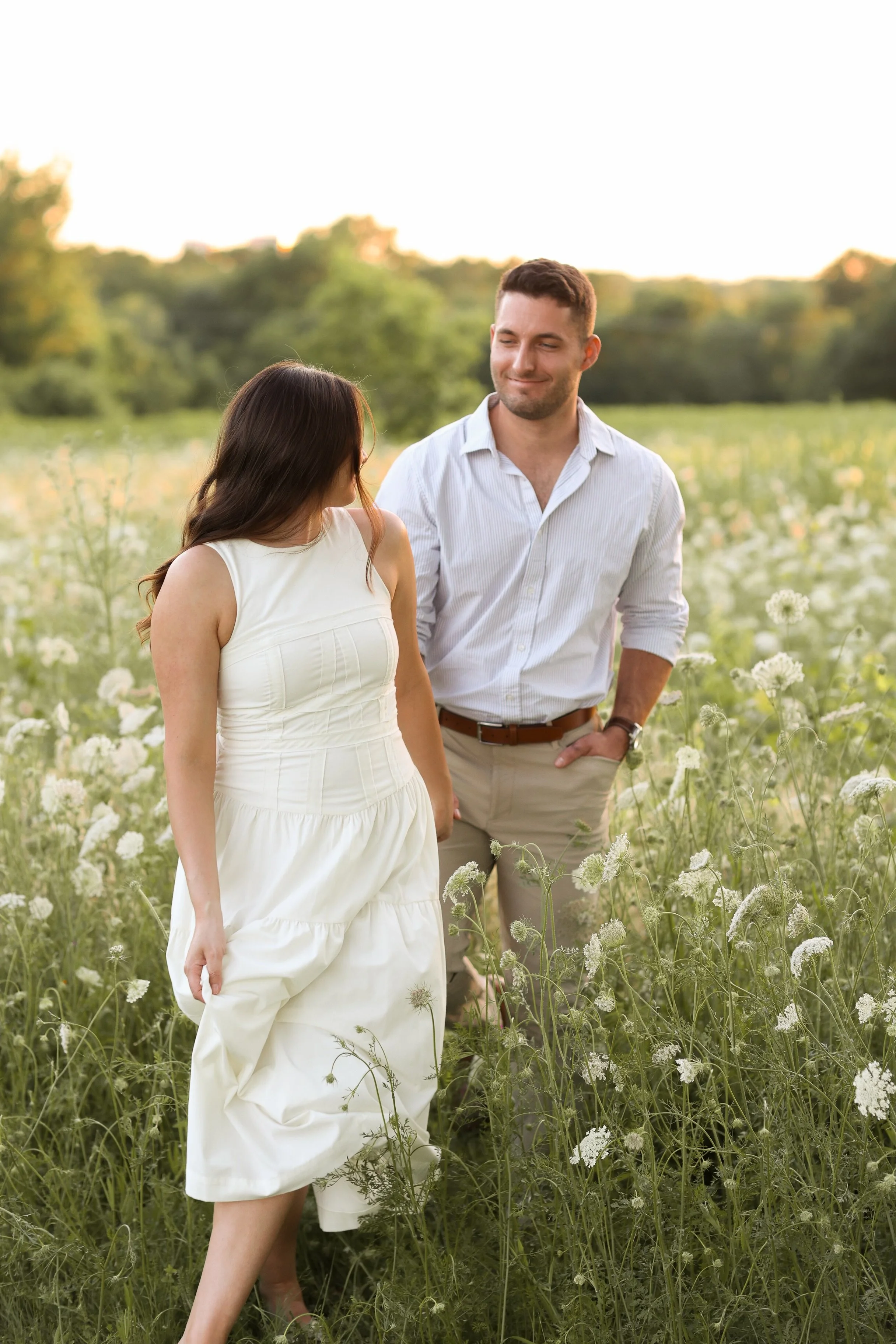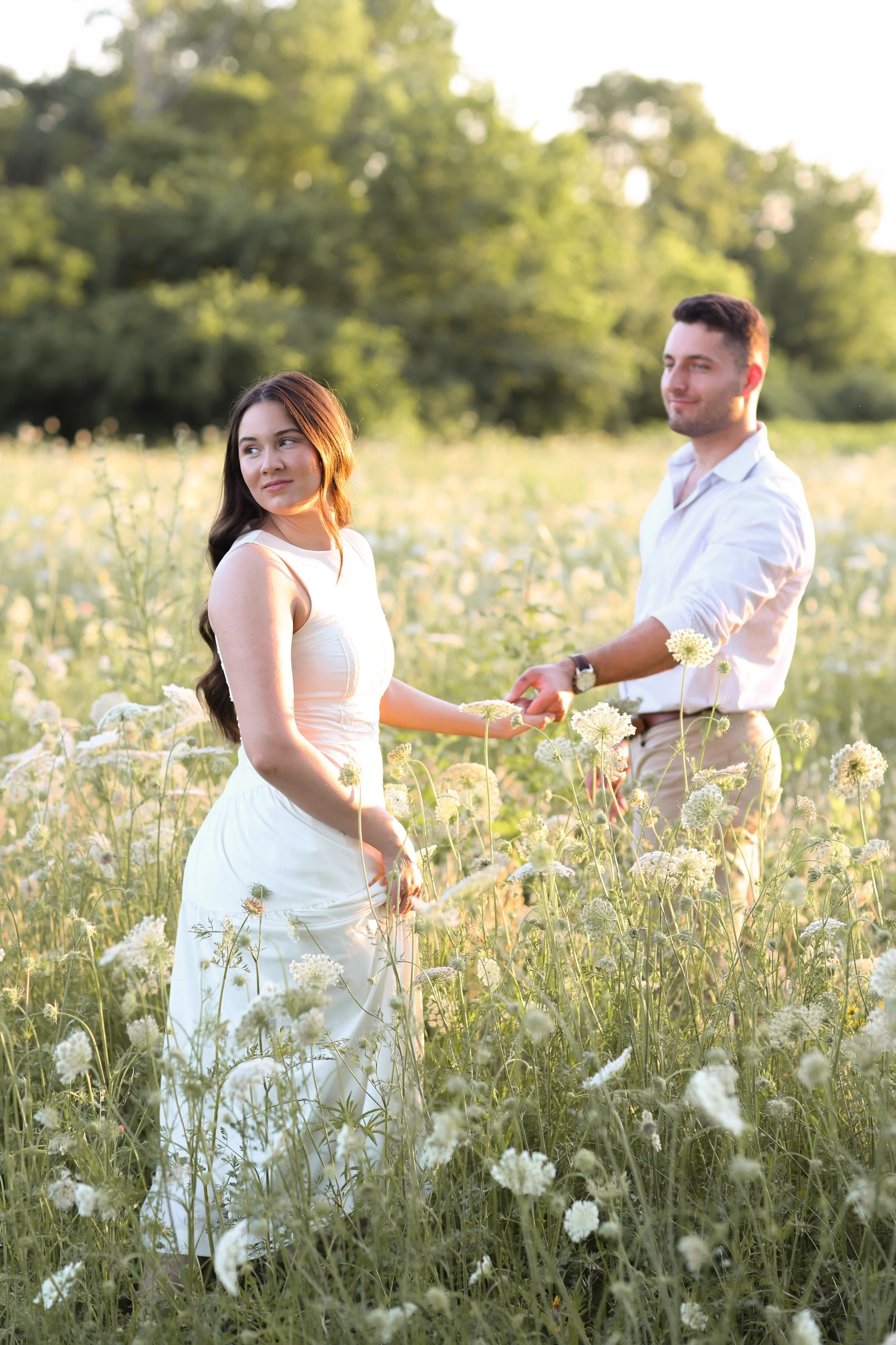 A woman in a white dress and a man in a white shirt holding hands in a field of white wildflowers during sunset.
