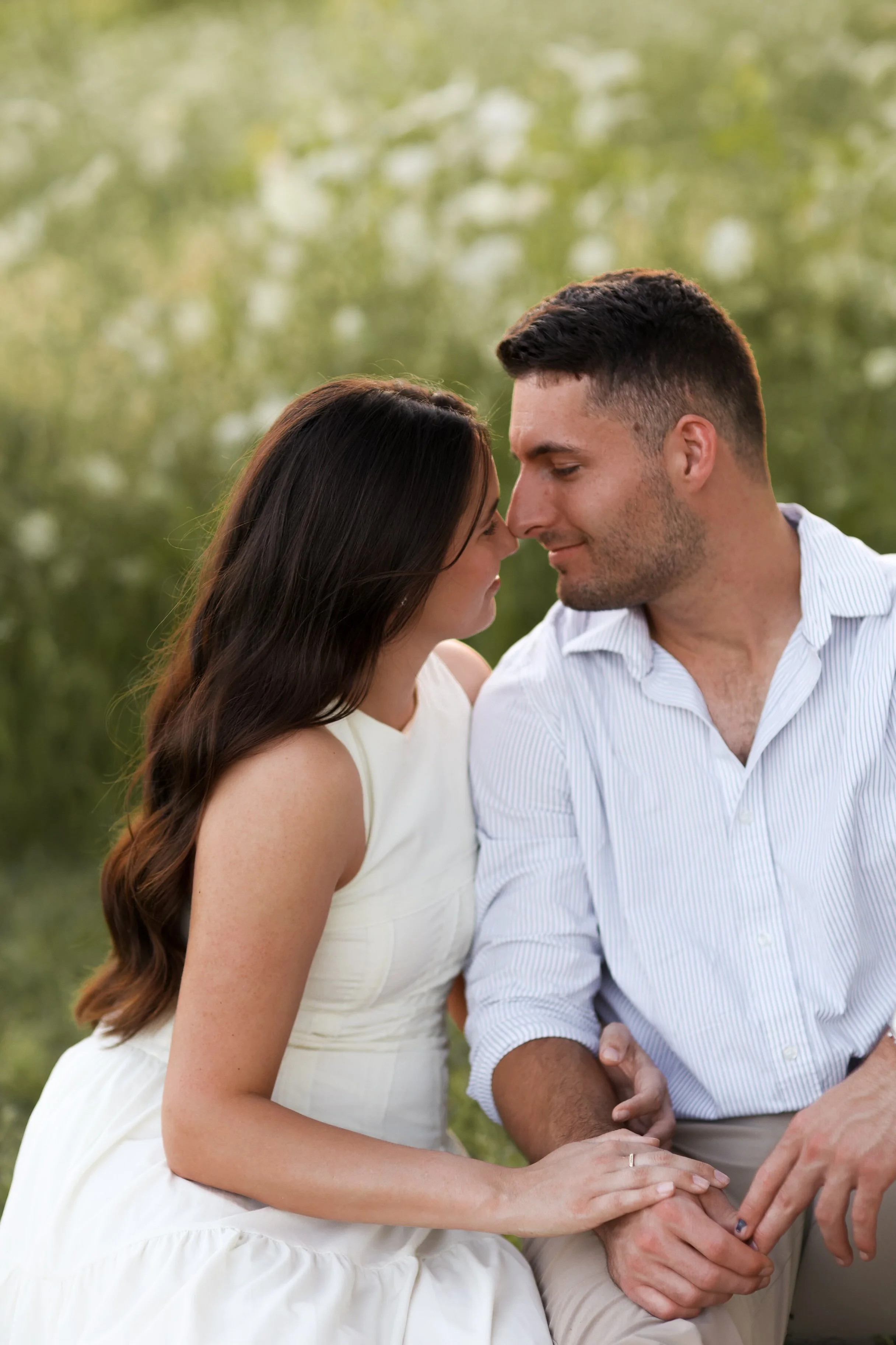 A young couple sitting on the grass in a field of white flowers, touching foreheads and holding hands on a sunny day.