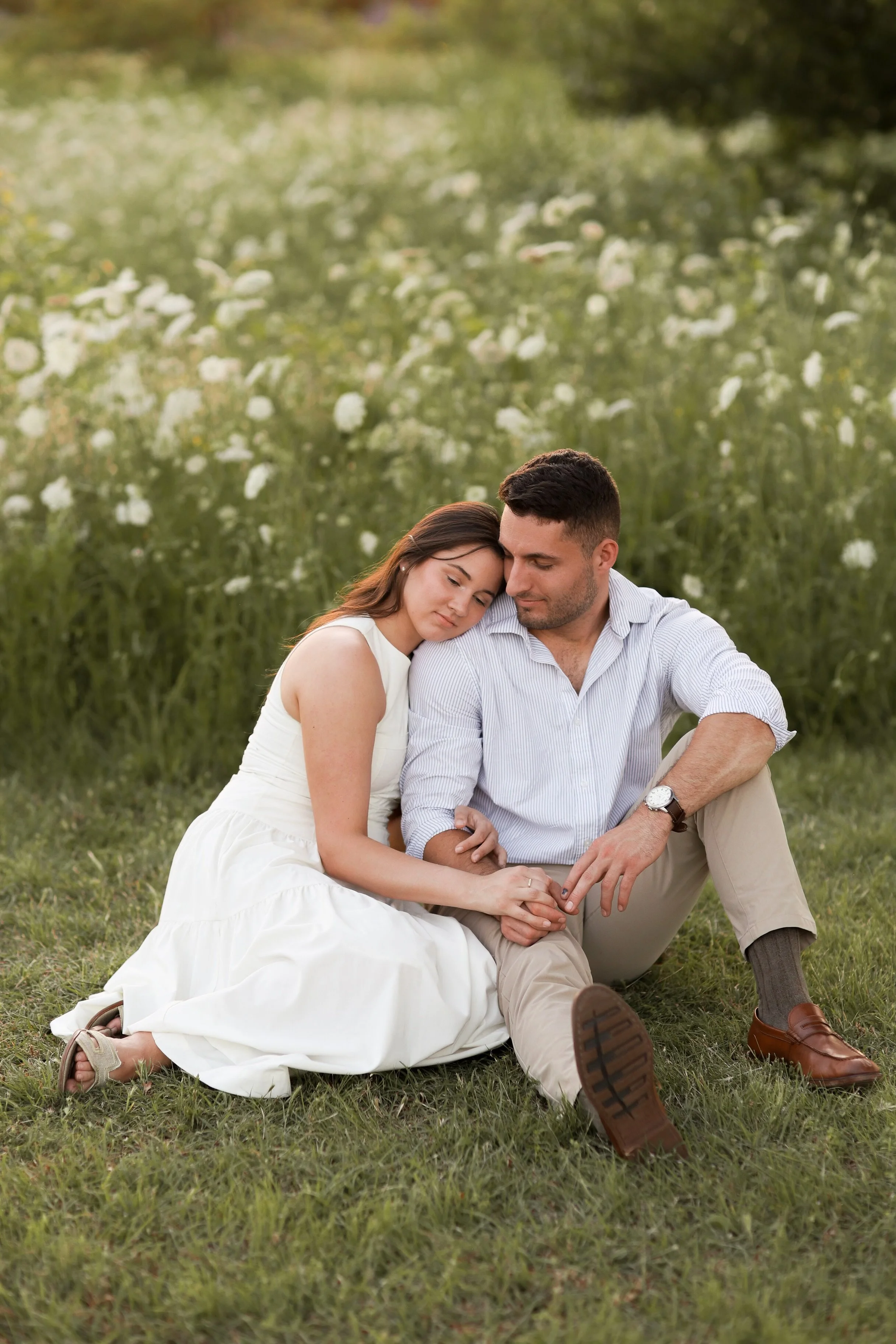 A couple sitting on the grass in a field of white flowers, with the woman resting her head on the man's shoulder.