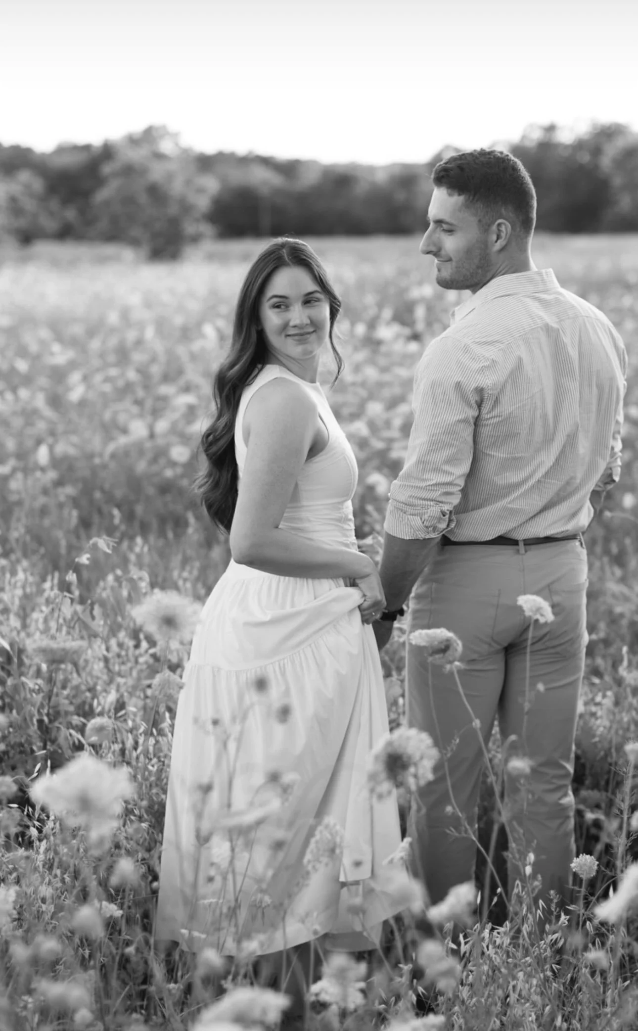 A black and white photo of a young couple holding hands in a field of flowers, with the woman wearing a sleeveless dress and the man in a button-up shirt and pants, smiling at each other.