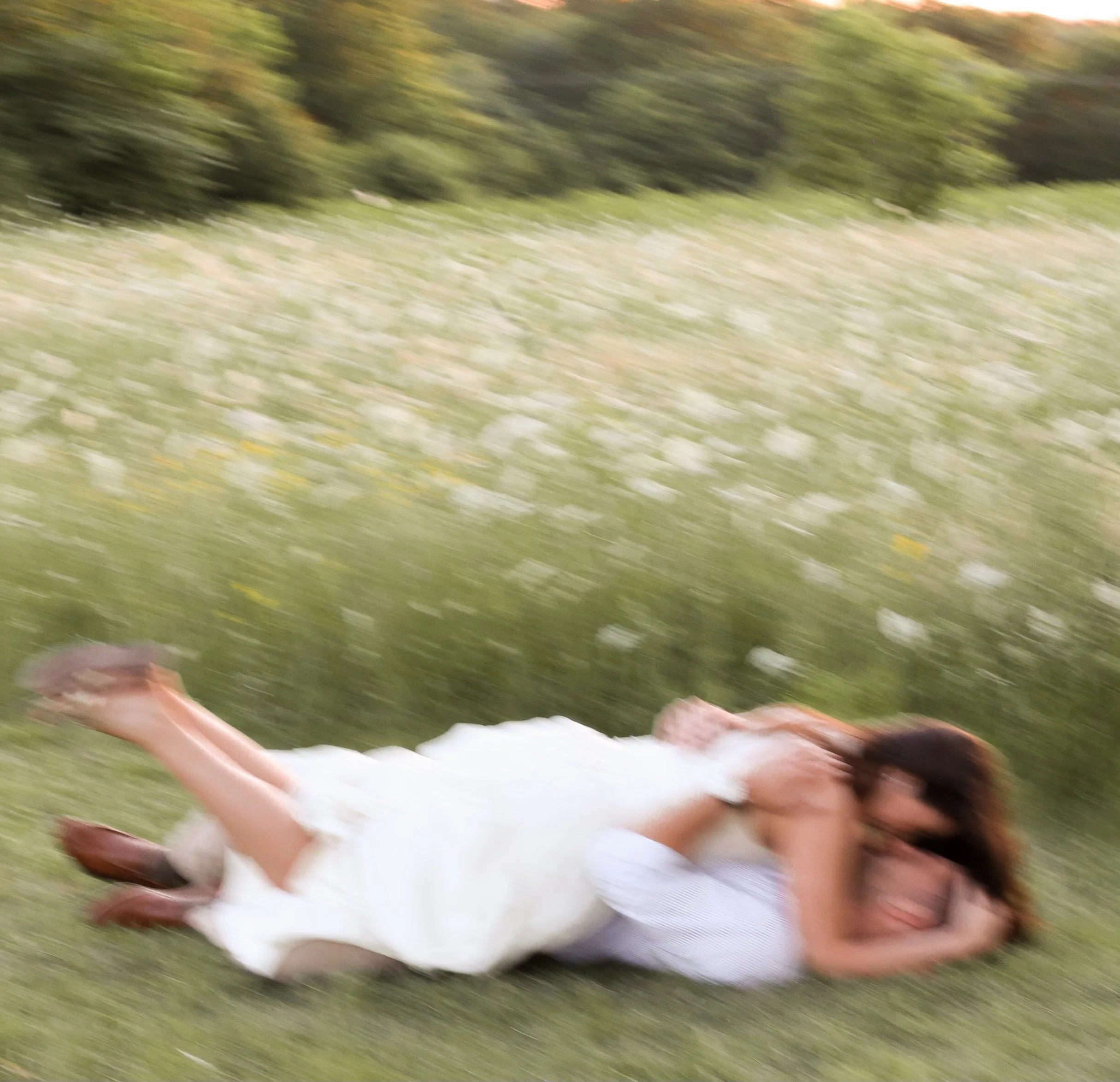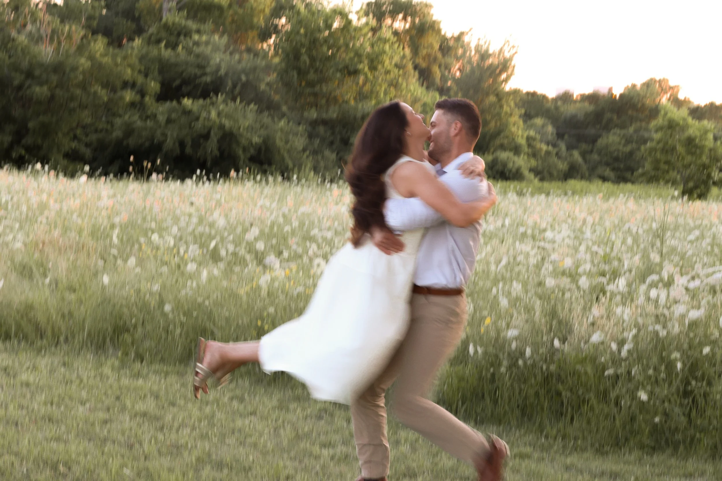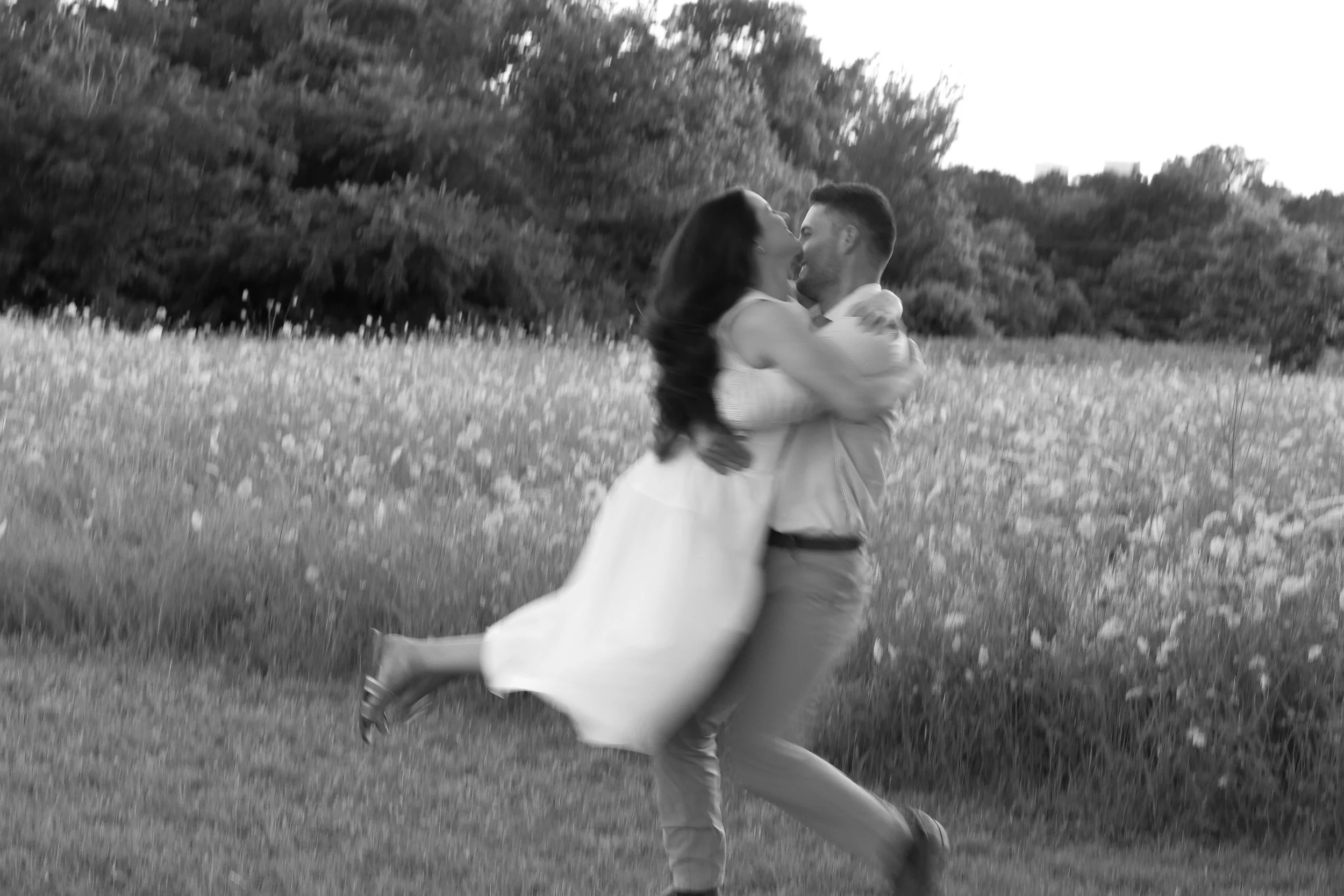 A black and white photo of a man lifting a woman in a field of tall grass and flowers, with trees in the background. The woman is wearing a white dress and the man is in a light-colored shirt and pants. They are embracing and about to kiss.