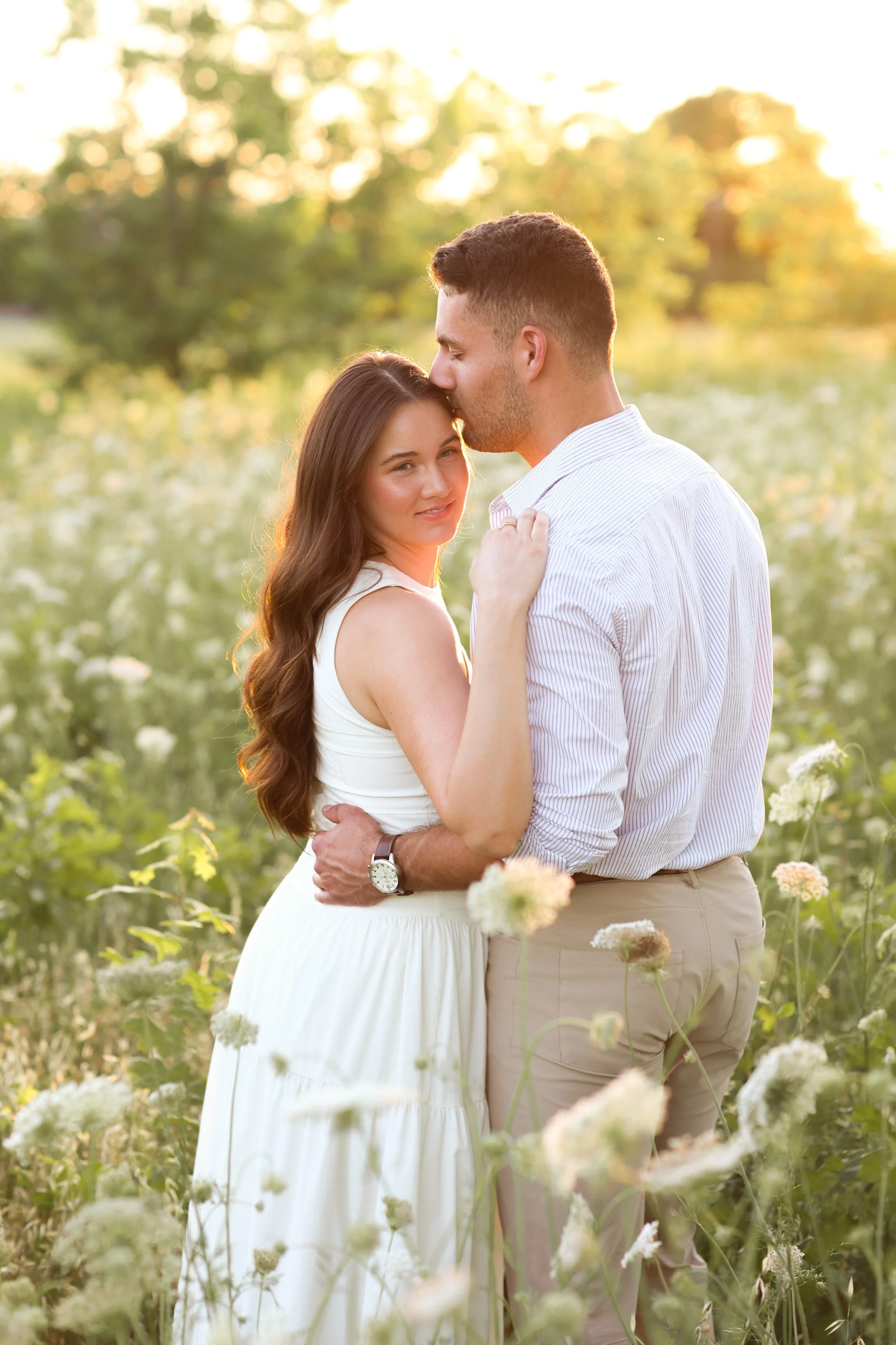A couple embrace in a field of white flowers during sunset, with the man kissing the woman's forehead, and she looking at the camera.